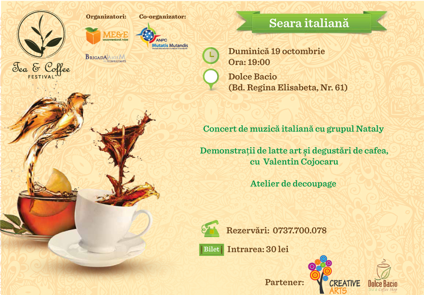 După ce ne vom bucura privirile cu desenele din lapte făcute în ceșcuțe de espresso, le vom savura gustul, în timp ce ne vom delecta cu un concert de muzică italiană susținut de Nataly . Pentru cei îndemânatici mai avem ceva: un atelier de decoupage.