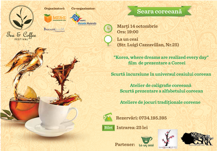 Vă așteptăm la Seara Coreeană, marți, 14 octombrie, ora 19:00, în ambianța perfectă a ceainăriei La Un Ceai (Luigi Cazzavillan, nr 25)